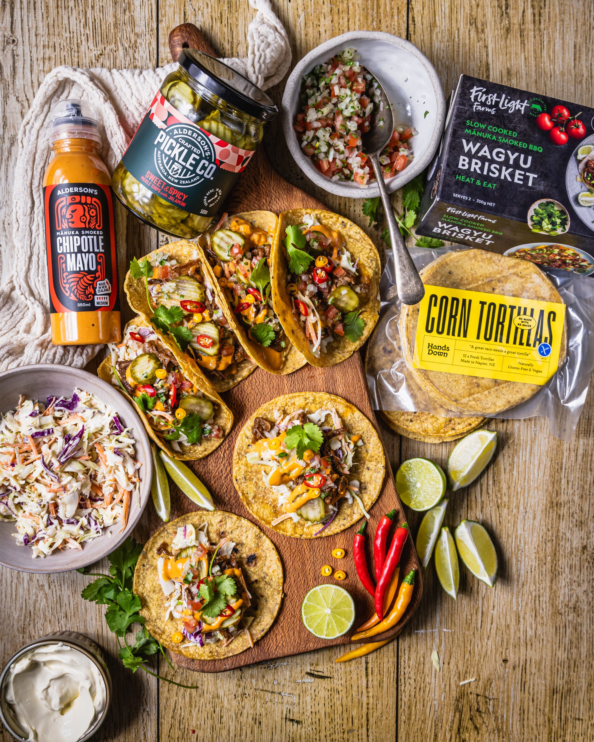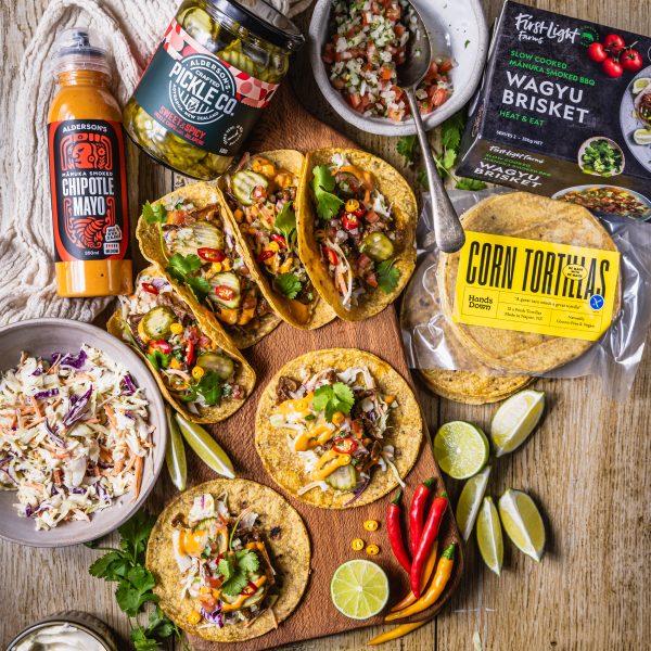 To celebrate the launch of our brand-new Brisket burger and our precooked Manuka Smoked Brisket we have teamed up with some of our friends Alderson’s and Hands Down tortillas to bring you the perfect solution for “What’s for dinner?”