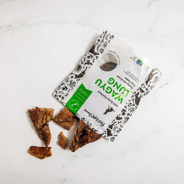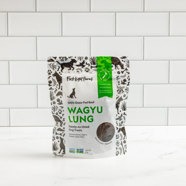 First Light Farms Wagyu beef lung treats are intended as a supplement to a complete and balanced diet. For all breeds and ages.